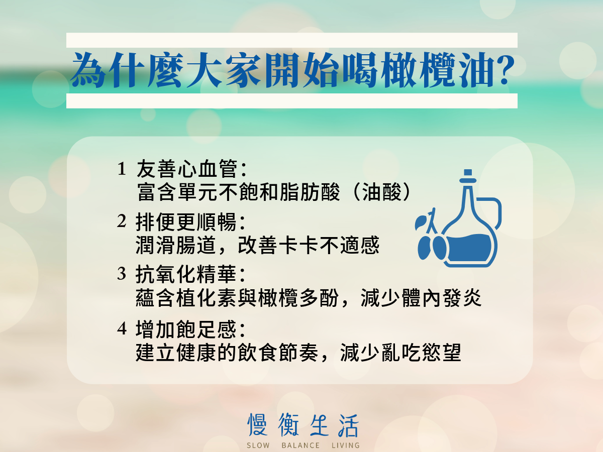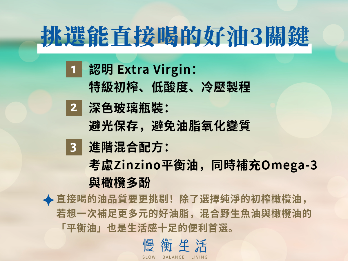如果你是那種平常飲食已經有在注意油脂品質的人,下一步通常會開始思考:「那我是不是可以直接喝橄欖油?」其實,只要選擇品質好的初榨橄欖油、控制好攝取量,把它當成日常油脂補充的一部分,是不少人近年開始嘗試的生活方式做法。