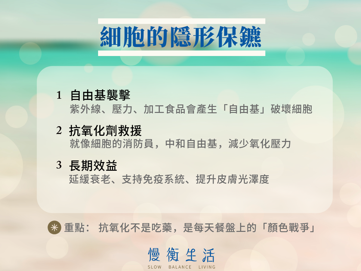 慢性病(如心血管疾病、糖尿病)其實都是細胞長期受損的累積。抗氧化能幫你做三件事: