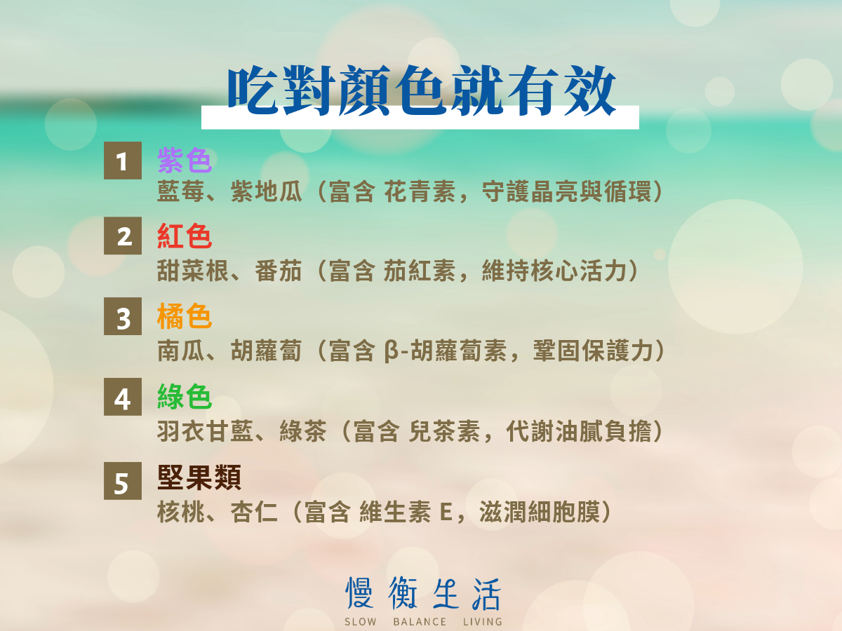 | 綠色 | 深色蔬菜、酪梨 | 葉綠素、兒茶素 | 整體偏向日常的修復與代謝支持。 |
