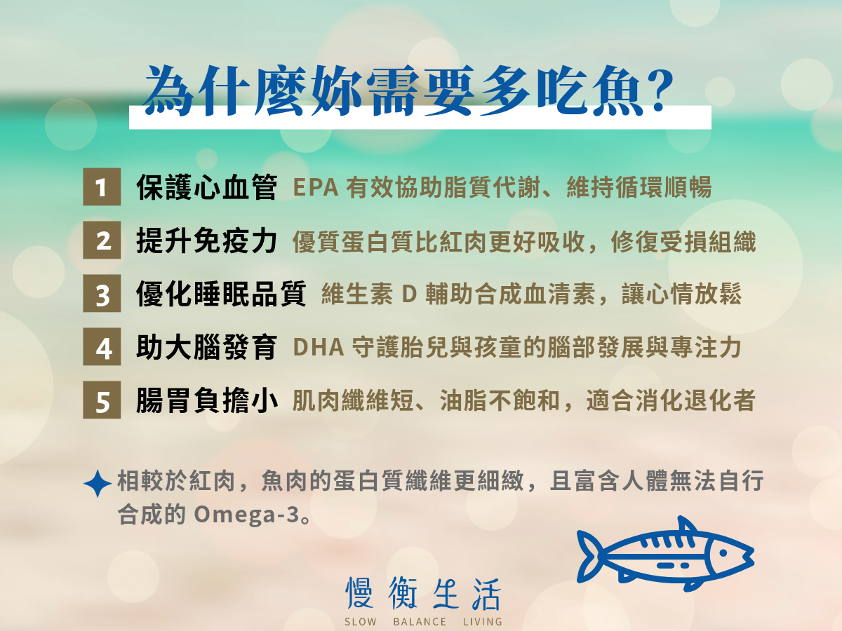 分辨季節性魚種,了解不同魚類的營養組成,吃魚不只是會變聰明,而是魚類中的 Omega-3、維生素 D 與優質蛋白,都能提供身體所需營養。