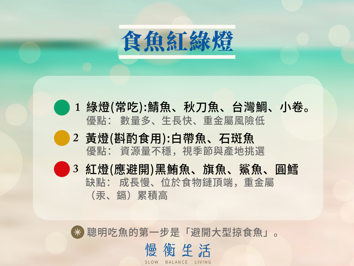 - 綠燈魚類:數量多、生長快,捕撈對環境傷害小,像是鯖魚、秋刀魚、台灣鯛、小卷。