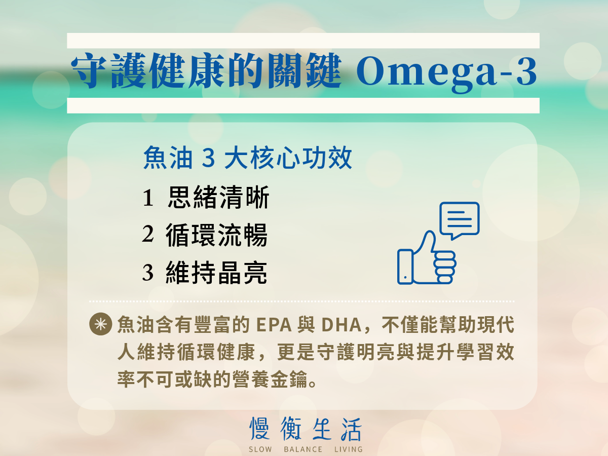 魚油中的 DHA,可以幫助頭腦清晰,維持良好的思緒與專注力,特別適合學生與上班族群。