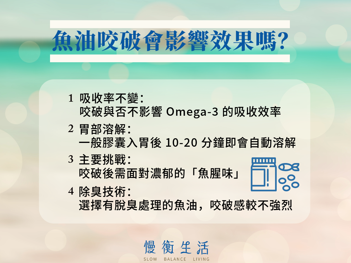 雖然咬破膠囊對魚油吸收或身體沒有太大的問題,但可能會帶來這些影響: