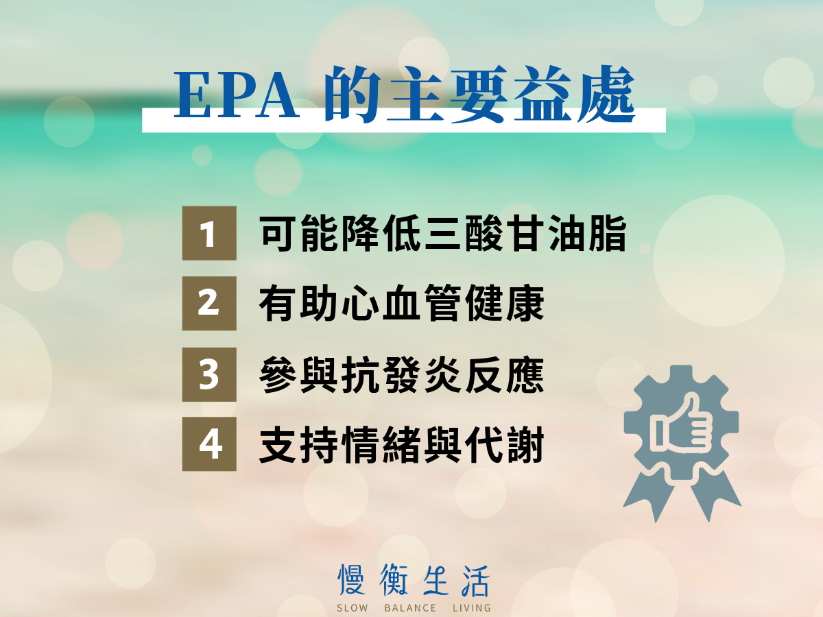 很多研究都在討論Omega-3(包含EPA)跟血中三酸甘油酯水平的關係。特別是EPA含量高的來源,在一些臨床觀察中被注意到與三酸甘油酯的調節有關聯。日常飲食多吃魚,或適量補充,有些人會看到自己血檢數字有些變化(當然每個人體質不同,數據一定也不一樣)。
