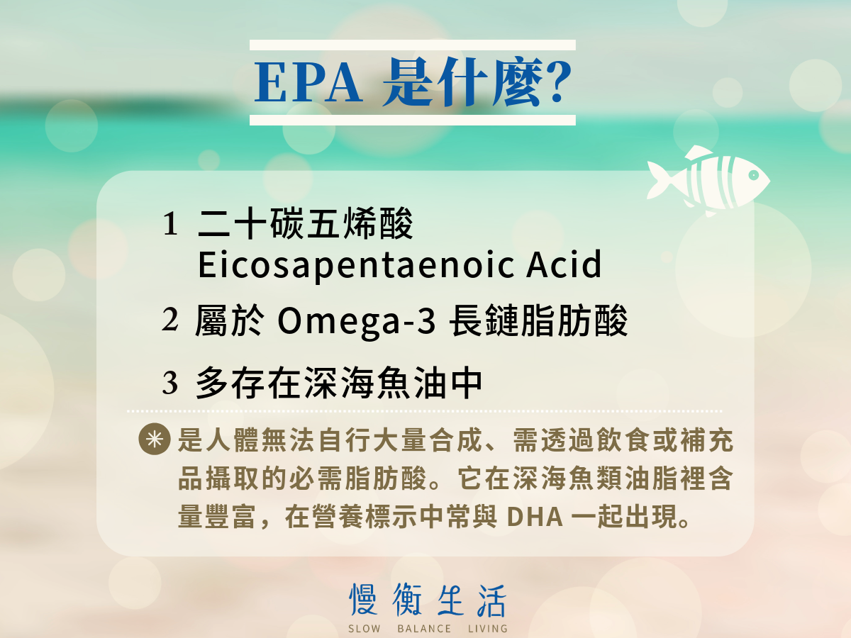 EPA(二十碳五烯酸)是深海魚裡常見的一種Omega-3脂肪酸,人體無法自己大量製造,所以多半靠飲食補充進來,比如常吃的鮭魚、鯖魚、沙丁魚。
