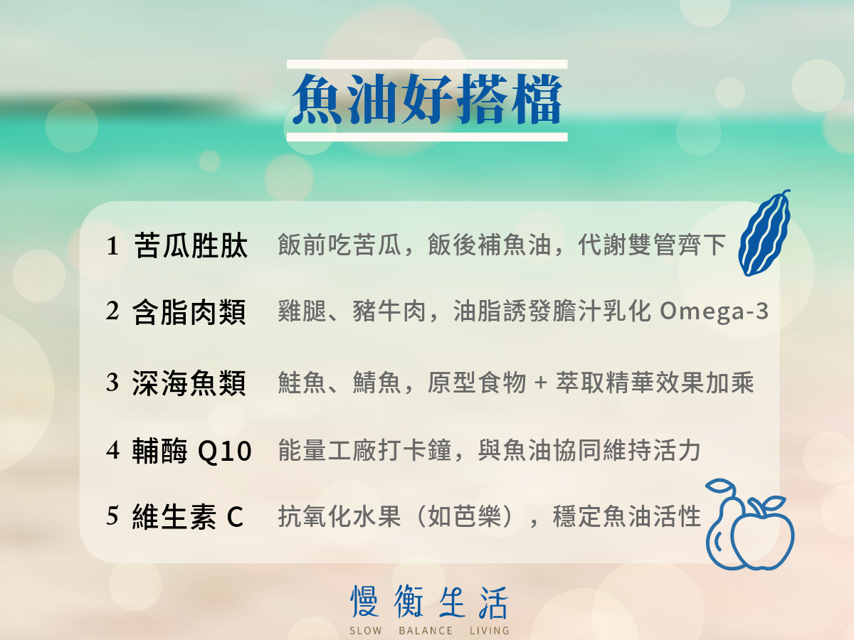 聽到魚油就會想說是油,結果就不想再配有油的食物,可能就改吃豆腐、青菜這類比較清淡的食物,可是實際上魚油如果要能好好讓腸胃吸收,食物的脂肪是很重要的。