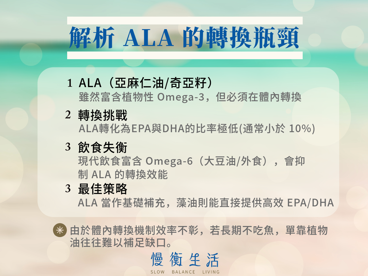 問題就在這個轉換效率。一般估計,只有 5%至 15%的ALA能順利轉換成 EPA,DHA的轉換率又更低。