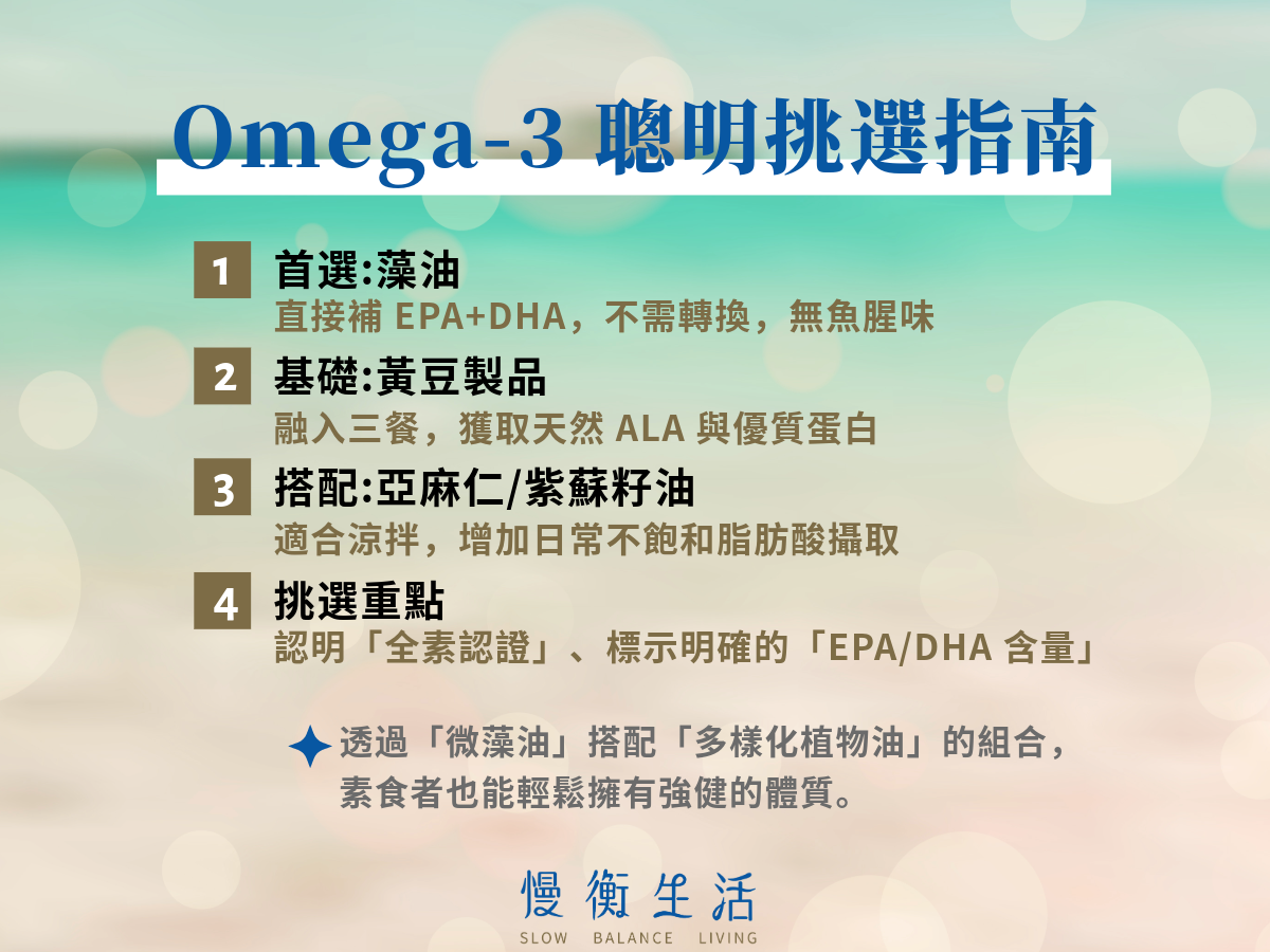 產品選擇上,優先看 EPA 和 DHA 是否分開標示毫克數,Omega-3總量是否清楚,以及是否有第三方檢測和素食認證。這三個資訊都有的產品,可信度比較高。